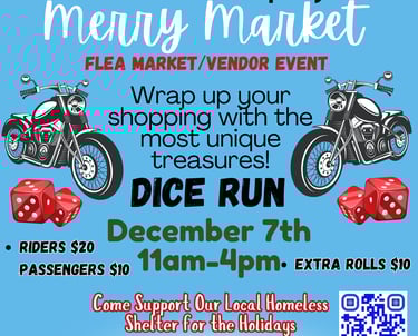 This event will be for the shoppers and the riders both! Accepting Vendors and Food Trucks, having music, raffles and a Dice Run is sure to be fun! I have gotten up with our local homeless shelter and received an extensive list of all the things they are in need of. These guys do so much for our homeless community, it’s time they get some good ole local help. We don’t know who or how folks end up in their situations…but it could happen to any of us, at any time. Let’s come together here, and help to make a difference right here, where we live. Oh, and let’s SHOP!!